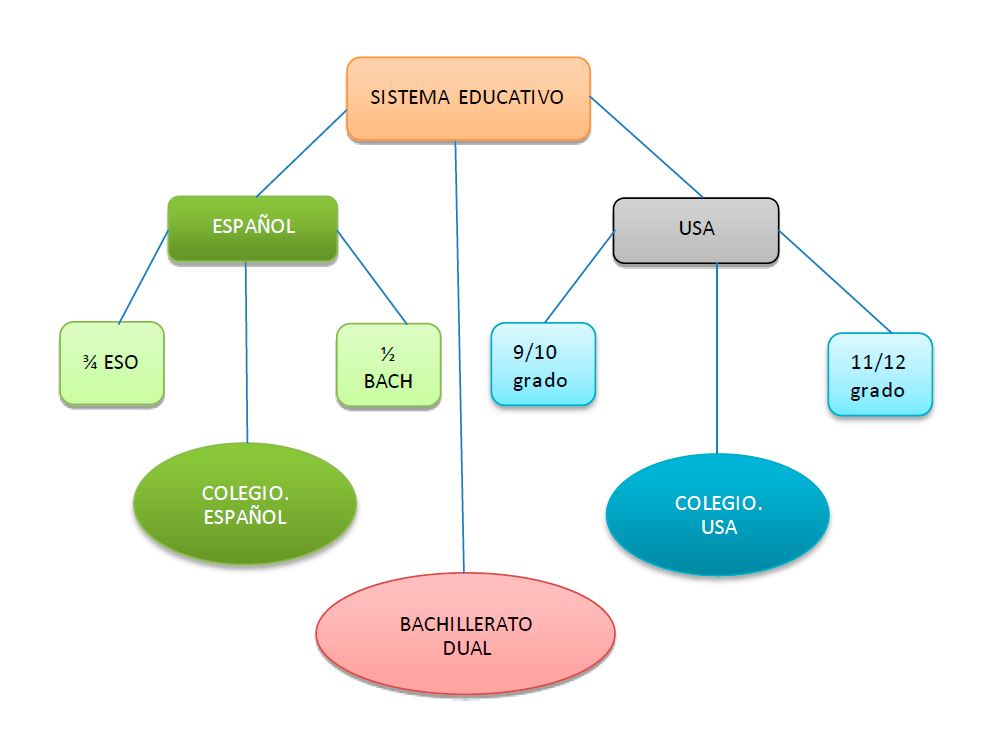 - Sistema educativo DUAL: Es una combinación del sistema educativo español más el sistema educativo americano. Se puede llevar a cabo desde el 3º ESO español (grado 9 americano) – 2º Bachillerato español (grado 12 americano). Al finalizar obtendrá ambas titulaciones: española y americana).